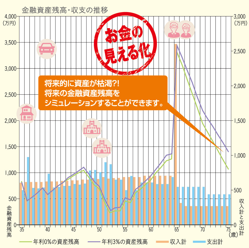 ライフプランシミュレーションは、家計収支を見える化することができます。シミュレーション結果をもとに一人ひとりのライフプランに沿った投資信託を活用した資産形成の方法をご提案することができます。